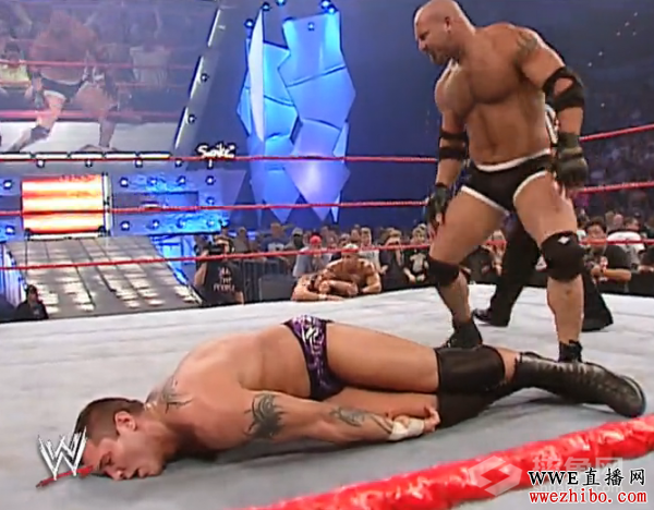 高柏(Goldberg)激战HHH(Triple H),兰迪·奥顿(Randy Orton)突然冲进擂台袭击高柏却惨遭反杀,而身为老大的HHH一脸无奈,只能站在擂台边上看着兰迪·奥顿惨遭战神的毁灭性之锤!